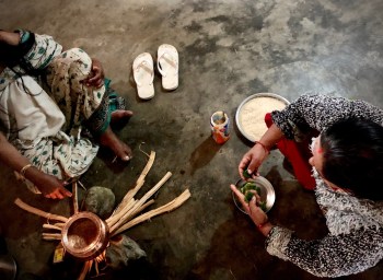 Yesterday, on the solstice, Didi and Pascal and I went out to Tuli Aamaa’s house, where her relatives are sitting kriya, the thirteen days of mourning. We sat outside talking with her son Ram Chandra dai, and found things here and there to help out with as callers came in and out of the house. Didi helped Tuli Aamaa’s daughter in law Tara bouju prepare her daily meal, which has to be cooked in a single pot during the kriya period.